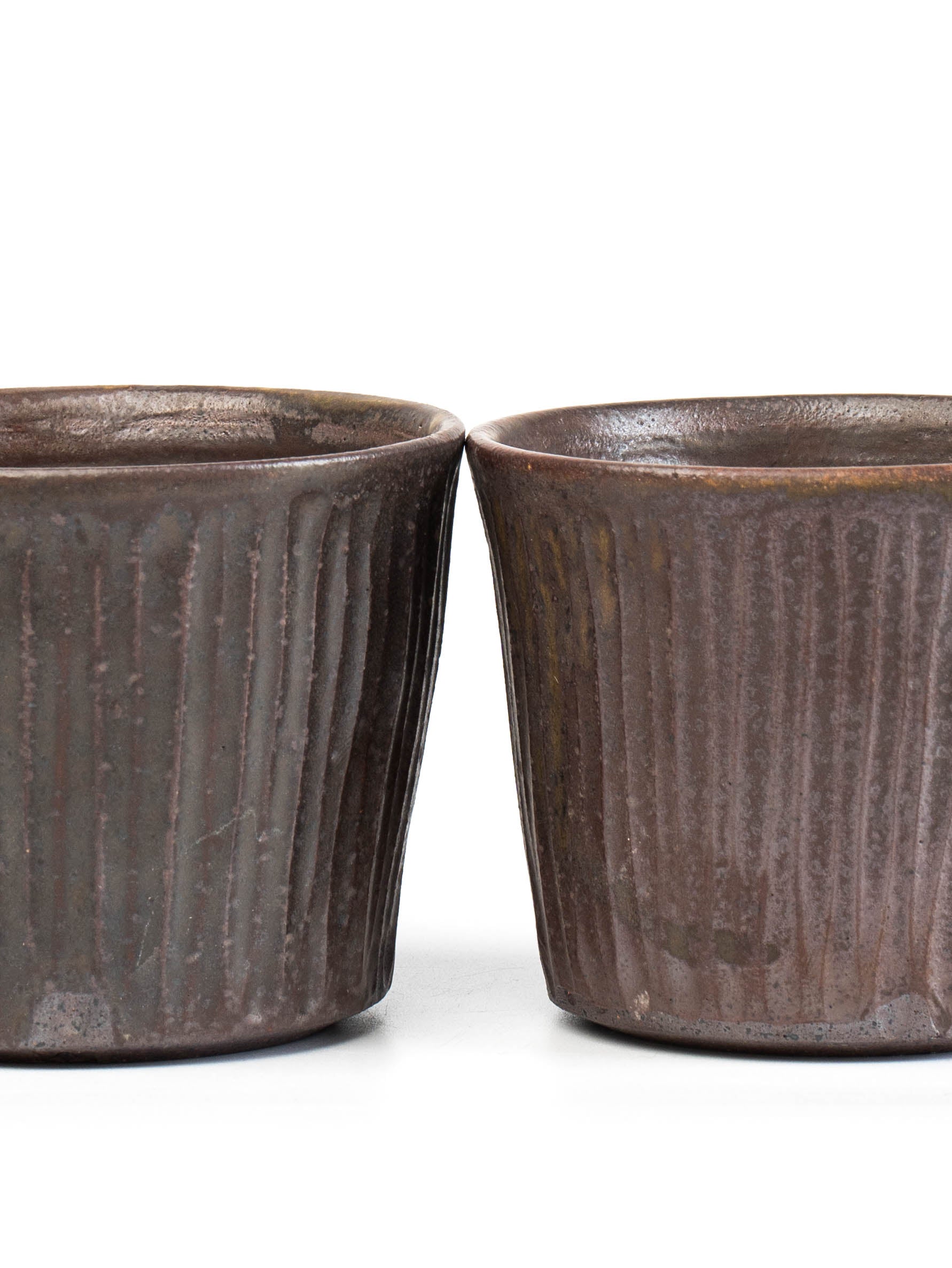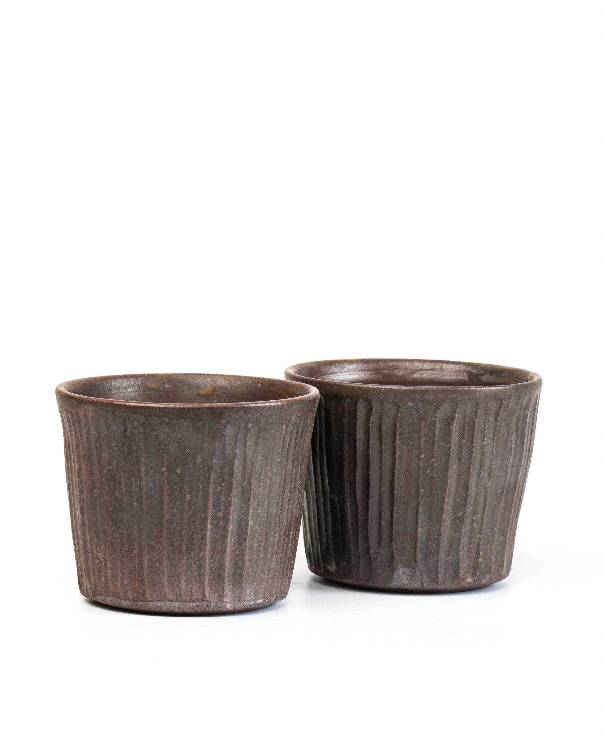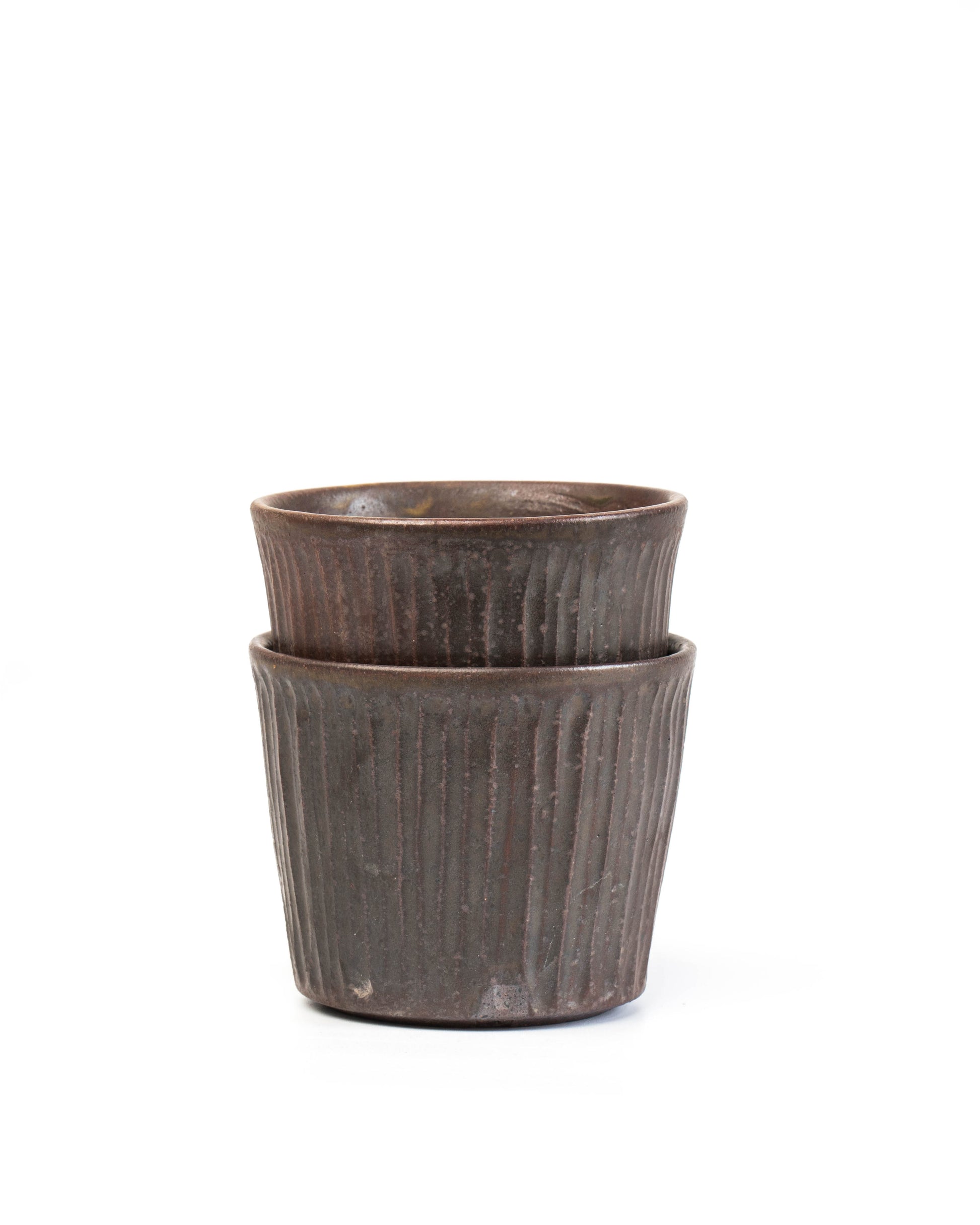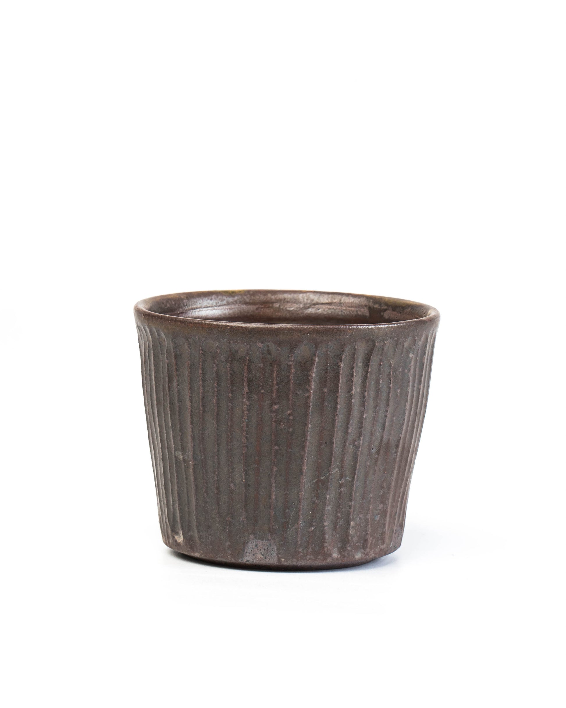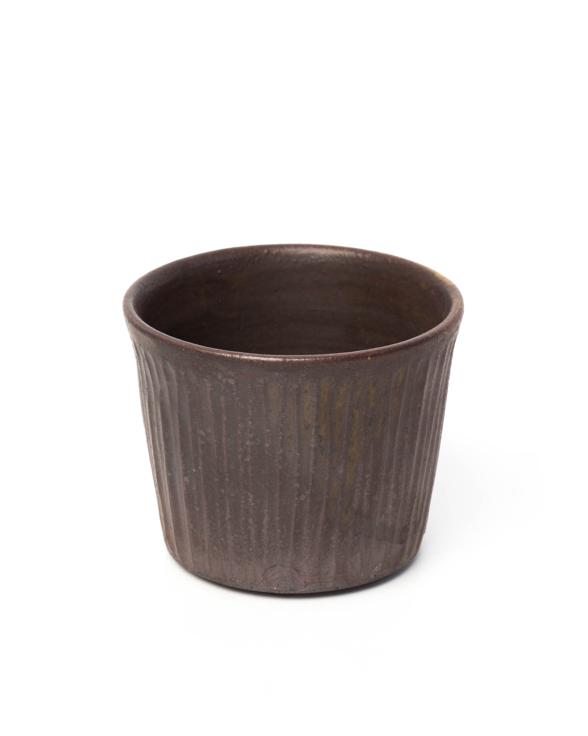 Wheel thrown teacup with fluted lines carved into the surface to create depth and a tactile texture. Glazed in a copper lustre glaze and fired in a reduction atmosphere, the surface shows soft tonal shifts and speckling.