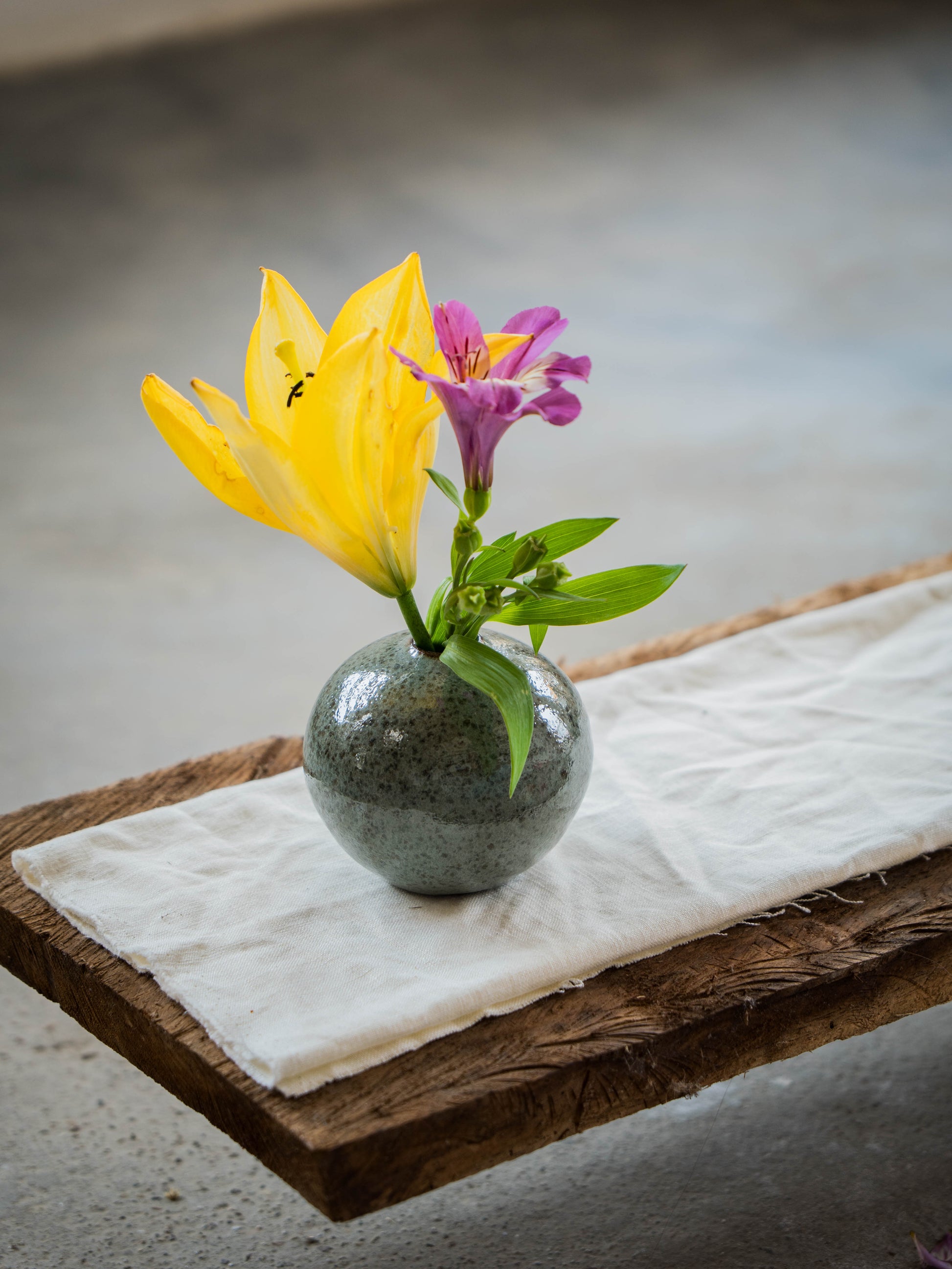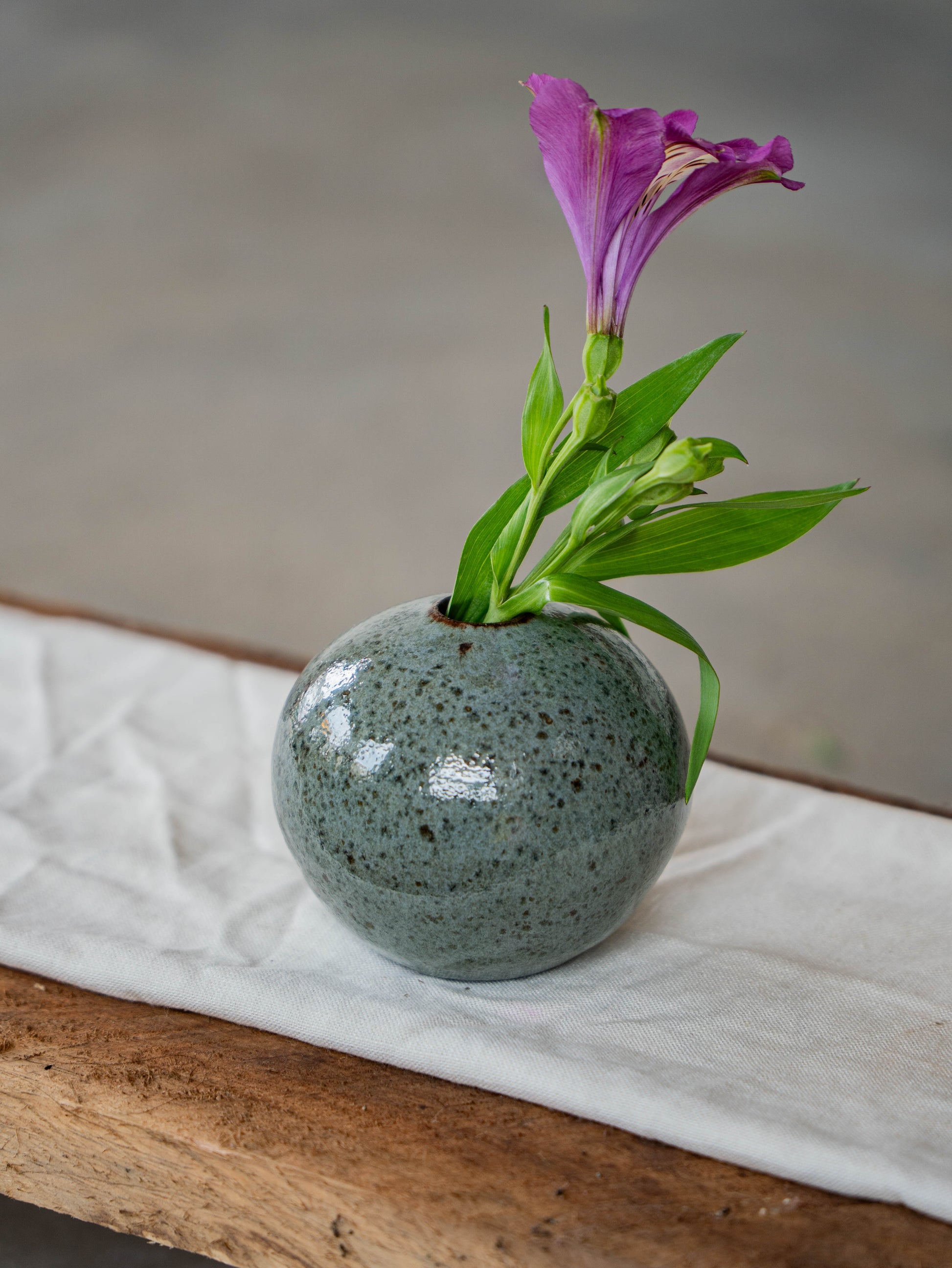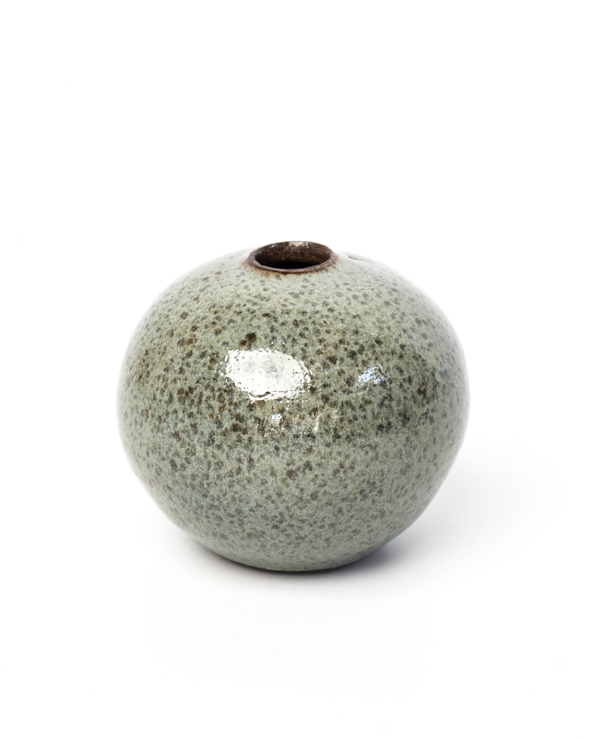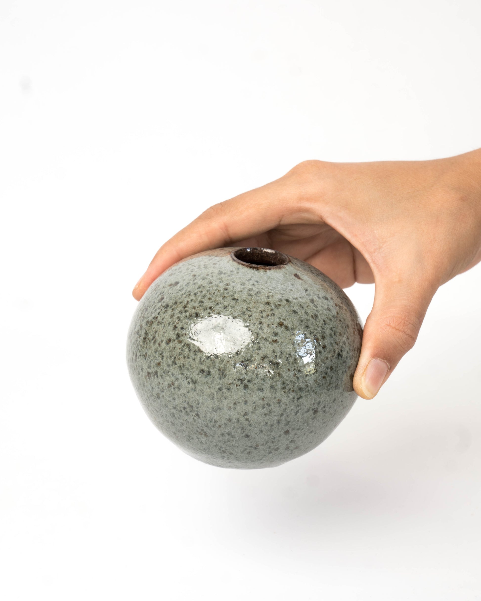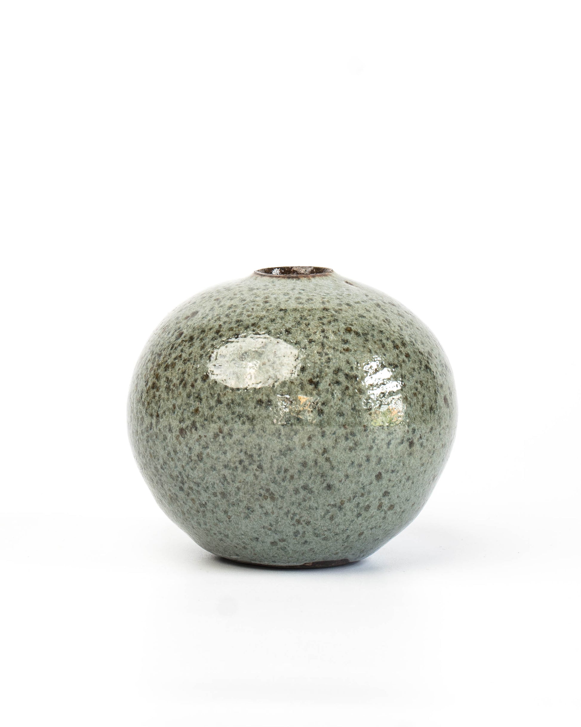 This small bud vase, in bright fern blue glaze, fits gently in the hand. Fired in a reduction atmosphere, which brings out a constellation of speckles and tonal variation across the surface. Can be displayed as a sculptural vessel or used functionally to hold seasonal flowers or dried branches.